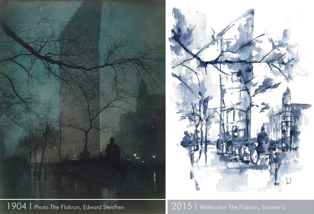 While reading about The Flatiron, I was struck by this photograph taken by Edward Steichen in 1904, and I couldn’t wait to paint this mysterious scene! So here it is… my visual reaction on paper!